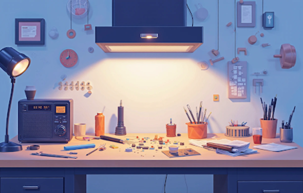 Кейс 3. Домашняя мастерская. Радиолюбитель оборудовал компактный радиомонтажный стол шириной 100 см и встроенным освещением. После добавления вытяжки работа стала комфортнее и безопаснее — даже при длительных сессиях пайки.