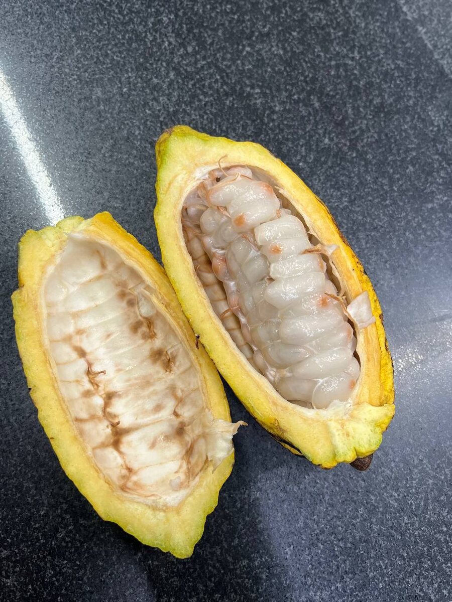 ) Если вы, как и я думаете, что должно напоминать, что-то шоколадное, то, как оказалось нет! Сам плод покрыт белой мякотью, пульпа или какао-мезга, называется! Для меня очень похоже на личи, желеобразная, сочная, первое вкусовое впечатление- интенсивная, освежающая кислинка и сладость, умеренная, не приторная, похоже на сладость груши. Ощущается что-то фруктовое, но не конкретно какой-то вкус. В интернете пишут, что тут и лимон, и манго, и ананас, и личи) Ну а сам какао боб - это плотное, хрупкое семя фиолетового или лилового цвета. Его нужно разгрызать, текстура твердая и маслянистая. Первое, что ощущается это горечь, но не, как у кофейного зёрна, а всё же словно Горький 100% шоколад, но без вкуса шоколада. Так же ощутила терпкость, словно от крепкого чая. Вот такие впечатления от моей дегустации🤗