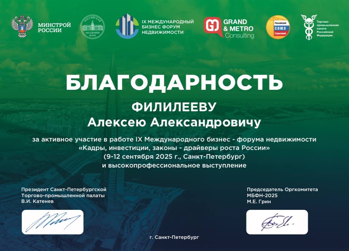 ! Наш руководитель компании Алексей Филилеев 10 сентября выступил в качестве спикера на IX Международном бизнес-форуме недвижимости в Санкт-Петербурге на сессии «Пространственное развитие и перевод земель – вызовы, практика, решения». (Перейти к посту) ⚫️ В своём докладе Алексей рассказал о заключении о соблюдении технических регламентов в Московской области — законное землепользование, поделился практическими рекомендациями по проверке земельных участков, предотвращению рисков сноса и повышению инвестиционной привлекательности недвижимости. ⭕️ По итогам форума организаторы направили официальную благодарность за участие и вклад в деловую программу. Для нашей команды это важное подтверждение того, что практический опыт и экспертные знания ценятся и востребованы в отрасли.