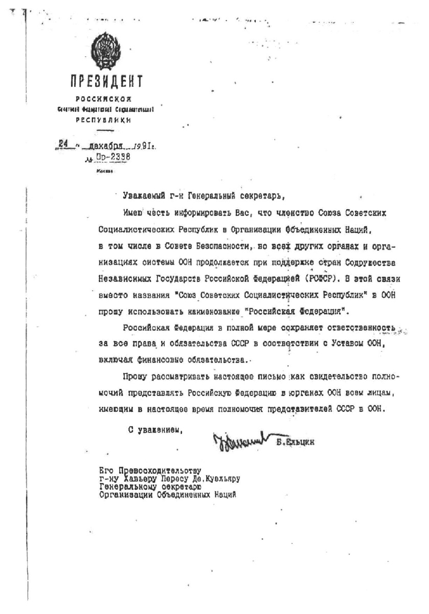 24 декабря 1991-го Президент РСФСР шлёт письмо Генсеку ООН Хавьеру Пересу де Куэльяру. Коротко и по делу:
