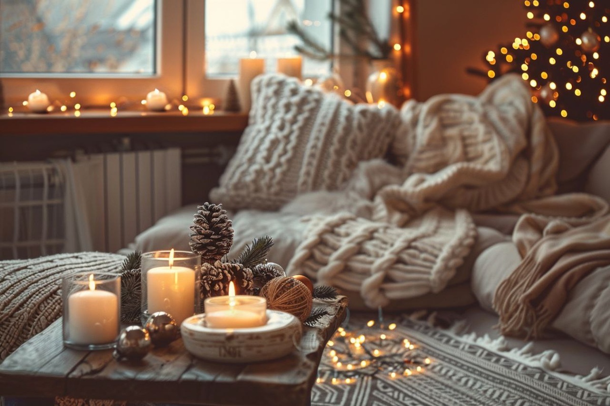candles in glass holders on a wooden coffee table, soft knitted throw blanket, textured linen pillows, faux fur rug, pine branches and subtle Christmas ornaments, warm ambient lighting, hygge atmosphere, shallow depth of field, cinematic composition, photorealistic, ultra-detailed, natural color grading, 35mm lens, soft bokeh --ar 3:2 --style raw --v 6 --s 150 --q 1 #нейросети #prompt #midjourney