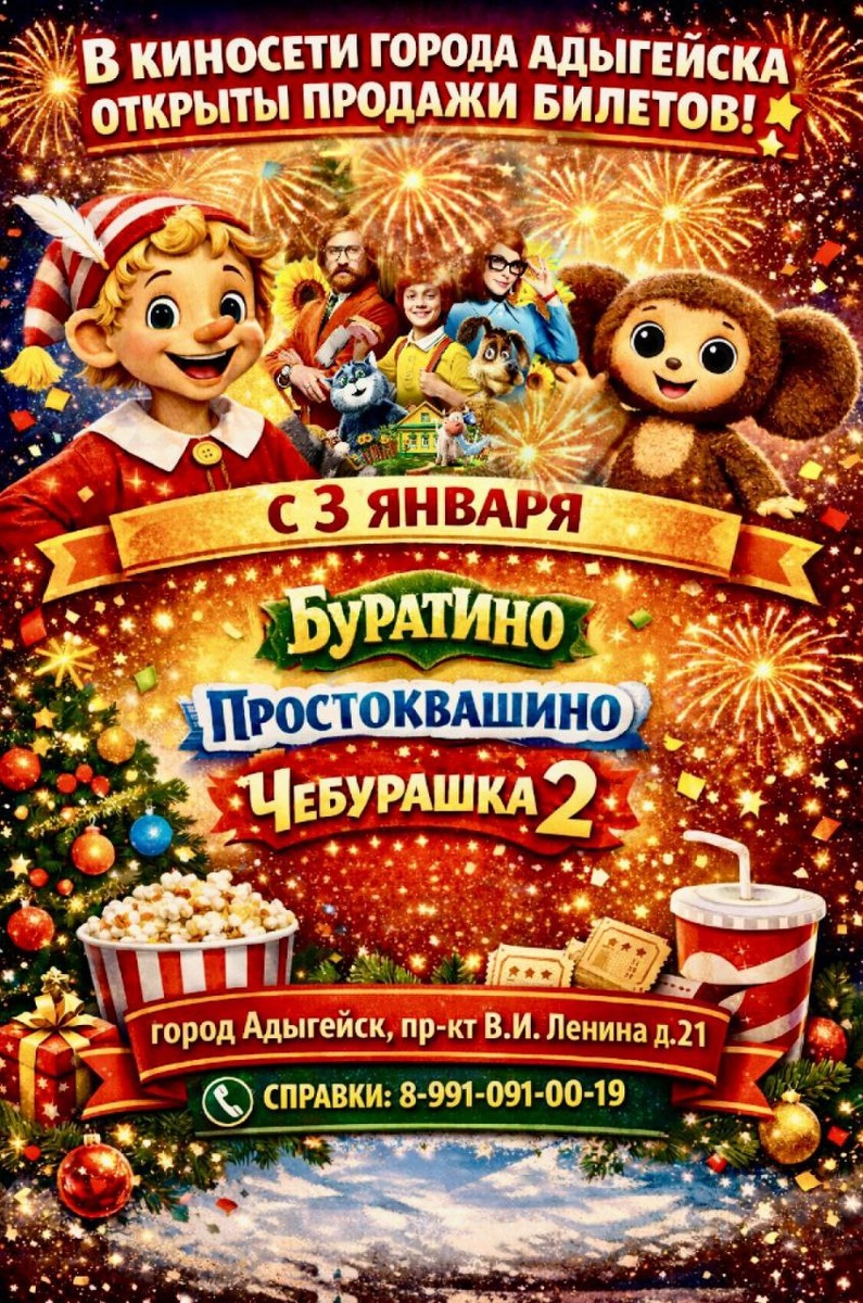 ! ✨ С 3 января стартуют показы самых топовых фильмов нового года, которые понравятся всей семье. 🍿 В программе: * Буратино * Простоквашино * Чебурашка 2 Успейте занять лучшие места и подарить себе праздничное настроение! 🎄✨ 🎟 Ссылка на билеты: kinowidget.kinoplan.ru/afisha/6764 📍г.Адыгейск , пр-кт. В.И.Ленина д.21 📞 Справки по телефону: 8-991-091-00-19 Ждём вас в кино! 🍿🎥