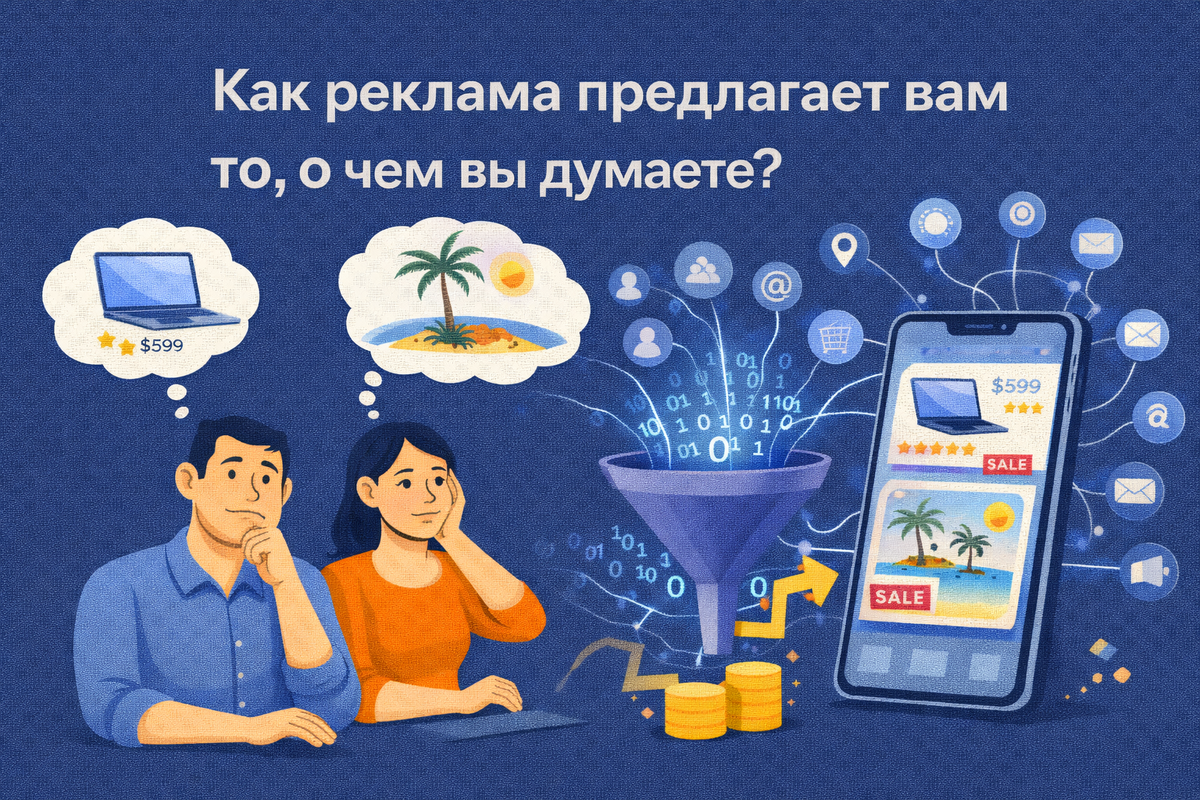Представь ситуацию: ты смотрел крутые кроссовки в интернет-магазине, но решил не покупать. И вдруг эти же кроссовки начинают преследовать тебя повсюду! В Instagram, ВКонтакте, на новостных сайтах... Будто они следят за каждым твоим шагом. Жутковато, правда? Ты не один! Каждый день миллионы людей замечают, как товары из их поисковой истории внезапно появляются в рекламе. Многие даже верят, что телефоны подслушивают наши разговоры. А некоторые начинают подозревать, что за ними следят. Однажды мой клиент Максим рассматривал туристическое снаряжение для похода. На следующий день его буквально атаковала реклама палаток, спальников и походных ботинок на всех сайтах. Он был в шоке и первым делом спросил меня: Андрей, что происходит? Спешу тебя успокоить - твой телефон не читает твои мысли. За всем этим стоит технология под названием ретаргетинг. Вот как это работает простыми словами: Представь, что это как следы от твоих ботинок на снегу. Маркетологи просто идут по этим следам и машут тебе р