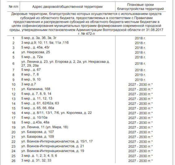 Далее infokam.su процитирует документ: «Согласно оценке уровня благоустроенности дворовых территорий города Камышина в соответствии с паспортами дворовых территорий, составленным по результатам инвентаризации, 100% дворовых территорий города оцениваются как неблагоустроенные исходя из минимального перечня видов работ по благоустройству дворовых территорий в соответствии с постановлением Правительства РФ от 10.02.2017 г. № 169».