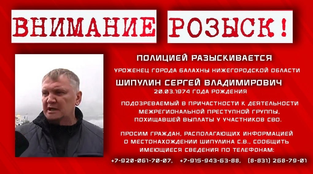 Следственный комитет разыскивает жителя Балахны, подозреваемого в присвоении денежных выплат участников СВО в Нижегородской области. Правоохранительные органы объявили в розыск жителя города Балахны, которого подозревают в хищении денежных средств, предназначенных участникам специальной военной операции. Ориентировка опубликована региональными управлениями Следственного комитета и МВД. В полиции сообщили, что в конце ноября были задержаны участники преступных групп, действовавших на территории нескольких регионов. В ходе дальнейшего расследования была установлена причастность к их деятельности 51-летнего Сергея Владимировича Шипулина. В следственном управлении СК по Нижегородской области возбуждено уголовное дело в отношении восьми мужчин. Их обвиняют в мошенничестве, совершенном организованной преступной группой в особо крупном размере по части 4 статьи 159 УК РФ. Кроме того, в рамках расследования возбуждено отдельное уголовное дело в отношении еще одного фигуранта. Его обвиняют в уб