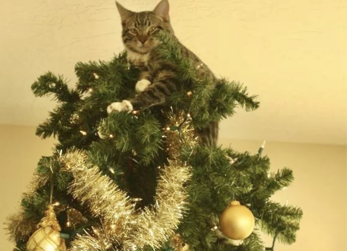 Я нашла самую высокую точку в комнате, чтобы лучше контролировать ваши жалкие попытки украшать! Эти шары такие соблазнительные, но я пока сдержусь. Главное, чтобы ты видел, как царственно я тут восседаю!