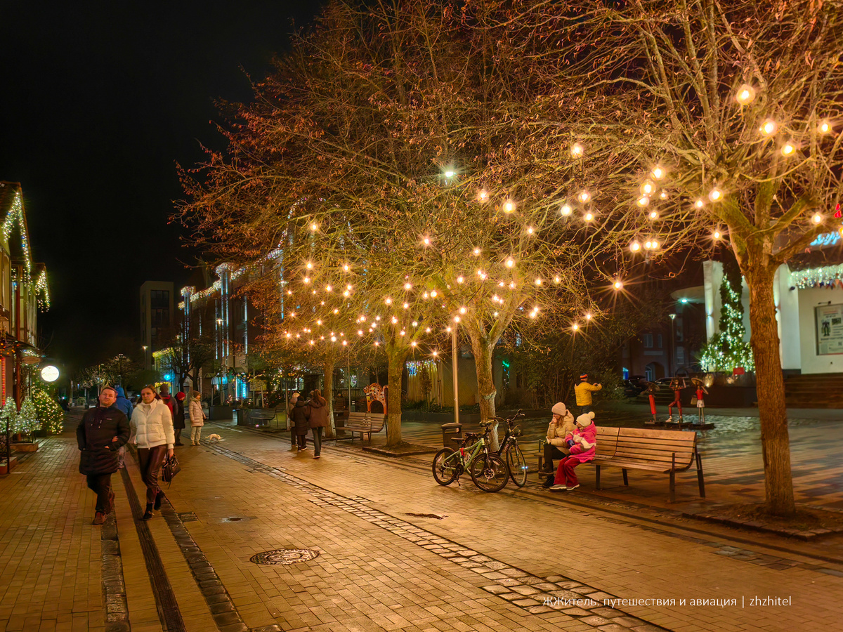 Зеленоградск — один из самых уютных городов Калининградской области. Он как будто сошел со страниц сказки, особенно это чувствуется под Новый год, когда всё украшено гирляндами и огнями, когда всё утопает в мерцающих гирляндах и тёплом свете огней. Предлагаю прогуляться по вечернему городу, где воздух пахнет морем и имбирным печеньем. Зеленоградск, словно кусок янтаря, лежит на берегу Балтийского моря. До 1946 года он принадлежал Германии и назывался Кранц. Немцы основали здесь фешенебельный курорт с модными водолечебницами, уютными кафе и ресторанами. Курорт Кранц получил заслуженный статус королевского. После войны территория Пруссии была разделена между Советским Союзом и Польшей. Советская часть была поделена между Литовской ССР и РСФСР. Все немецкие названия заменили на русские, а на некогда аристократическом курорте стали отдыхать уже советские граждане. Главная пешеходная улица Зеленоградска — Курортный проспект. В Зеленоградске проживают 17 тысяч человек. Город — один из самых