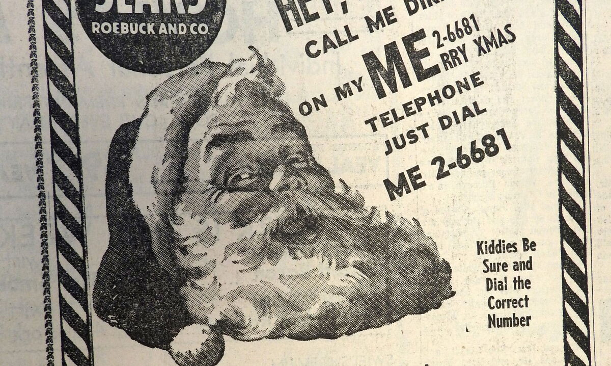 На картинке изображена оригинальная реклама Sears 1955 года из газеты, с тем самым неправильным номером телефона, который привёл к хаосу. Источник: https://krdo.com/news/sesquicentennial/2021/08/11/sesquicentennial-minute-the-famous-misprint-that-led-to-norads-santa-claus-tracking-tradition/.