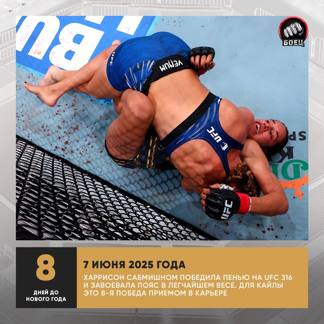 🎁 Наш обратный отсчет продолжается. На этот раз вспоминаем титульную победу Харрисон. Кайла довольно уверенно расправилась с Пеньей и стала чемпионкой UFC в легчайшем весе 🏆 Тогда финальной точкой стала кимура в конце второго раунда. Удержит ли американка пояс в 2026 и сможет ли она победить Нунес?