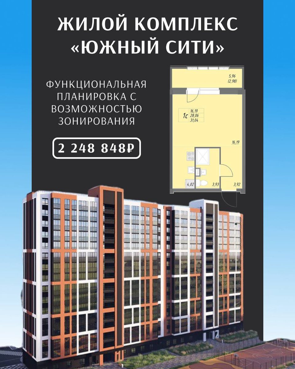 🏆 Квартира для идеального старта в ЖК «Южный Сити» всего за 2,2 млн! 🤫 Говорим честно: такие предложения долго не задерживаются. Студия 31 м² с просторным балконом - это готовое решение для покупателя, который ценит умные вложения и комфорт. 🤔Почему эта студия — идеальный выбор? 💰Выгодная цена-качество: Всего 2 248 848 за современное жилье в новом комплексе — это реально выгодное предложение на рынке. Идеальный вариант для первой покупки, инвестиции или комфортного гостевого варианта. 📐 Больше, чем просто «однушка»: Продуманная смарт планировка автоматически разделяет зоны на кухню, гостиную и спальню. Никакого ощущения «коробки». Только уют и функциональность. 🌿 Балкон 6,34 м² Дополнительное пространство, которое можно оформить как зону отдыха, небольшой сад или летнюю гостиную. 🏢 Живи сейчас, а не «потом»: «Южный Сити» — это готовый современный район с инфраструктурой, дворами без машин и всем, что нужно для жизни. Не нужно ждать годами развития территории. 🤔Кому по