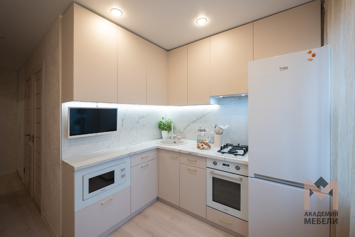 Наша новая работа — угловая кухня на ул. Фёдора Абрамова, 9/1 Эта кухня получилась светлой и спокойной, без лишних деталей. Мебель сделана на заказ, поэтому каждый модуль использует компактное пространство кухни максимально рационально. Корпус выполнен в декоре «Белый снег», а фасады — из МДФ «Софт Латте» с матовой, тактильно приятной поверхностью. Нежный бежевый оттенок поддерживает естественный свет из окна и визуально объединяет технику и стены в единую композицию. Ровные глухие фасады подчеркивают аккуратную геометрию кухни. Столешница и стеновая панель выполнены из Slotex «Кварцит». Рисунок камня плавно переходит с горизонтали на фартук. Соединение через еврозапил позволило сделать угол без видимого шва: стык герметичен, не собирает грязь и выглядит аккуратно даже при близком рассмотрении. Кухня под потолок: верхний ряд цельный, без антресолей и разрывов, что даёт больше мест для хранения и визуально «расширяет» помещение. В нижнем ярусе — выдвижные ящики и полки. Техника встроен