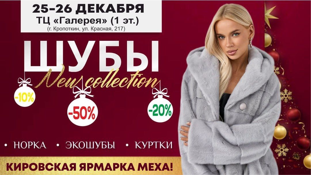 🔥 КИРОВСКАЯ ЯРМАРКА МЕХА И ШУБ, Г. КРОПОТКИН! Ждём Вас: ▫️ 25-26 декабря! 📍 ТЦ «Галерея» (1эт.), ул. Красная, 217. (с 10 до 19ч.) ДЛЯ ВАС ВЫГОДА И ВЫБОР: 🔥 Шубы из мутона – ОТ 9900 РУБ.! ⚡️ НОРКОВЫЕ ШУБЫ ДО - 50%! 🎁Новинка сезона-ЭКО МЕХ (в ассортименте)! 🔹 Огромный выбор: шубы, эко-мех, куртки, шапки, варежки. 🔥Каталог, акции и новости - все в одном месте. Присоединяйся к нашей группе в ВК https://vk.com/zolotovyatki и смотри полный ассортимент с фото и ценами, получай промокоды и привилегии для подписчиков. Подпишись сейчас и будь в курсе выгодных предложений и новых поступлений. ✅ Нужна консультация? Звоните! Наш Телефон: 📲8-922-903-32-83 Покупайте теплую и стильную шубу с МАКСИМАЛЬНОЙ ВЫГОДОЙ! #реклама