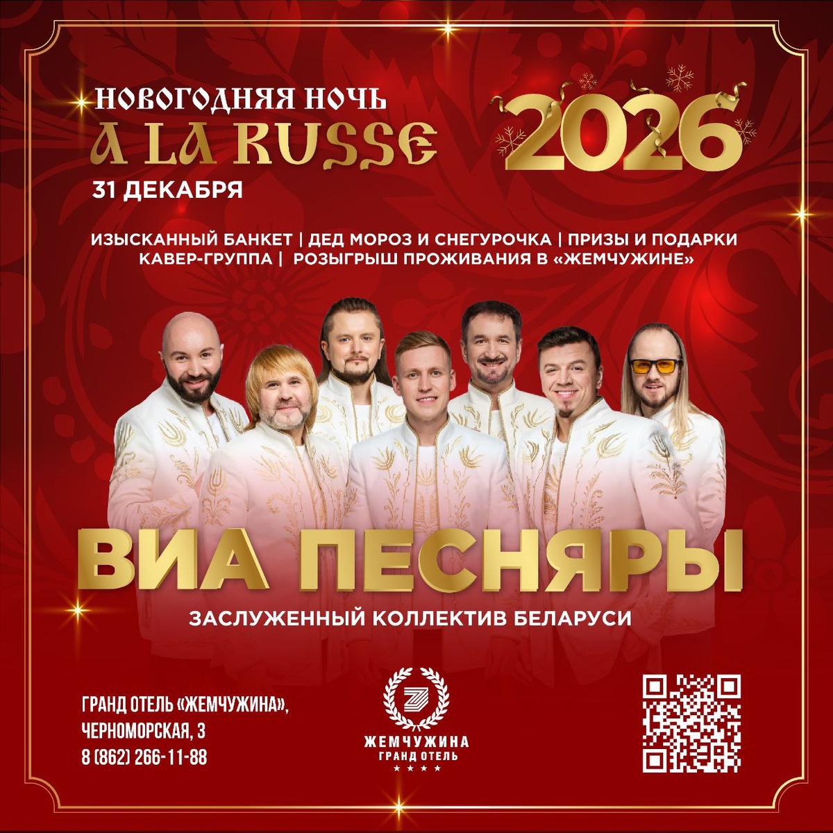 ! В программе главной ночи года – поздравление Деда Мороза и Снегурочки, розыгрыши от ведущих с главным призом - проживанием в «Жемчужине», яркие номера от шоу-балета AURUM, шоу богатырей и медведей, народные напевы в исполнении фолк-группы Marussya и зажигательные хиты от кавер-группы «Валькирия». ⭐Хэдлайнеры праздника - ВИА Песняры! Споем «Вологду» хором?! ❄️Окунитесь в настоящую русскую сказку вместе с «Жемчужиной»! ⭐ Вы можете забронировать только банкет или банкет с проживанием. Программа и бронирование