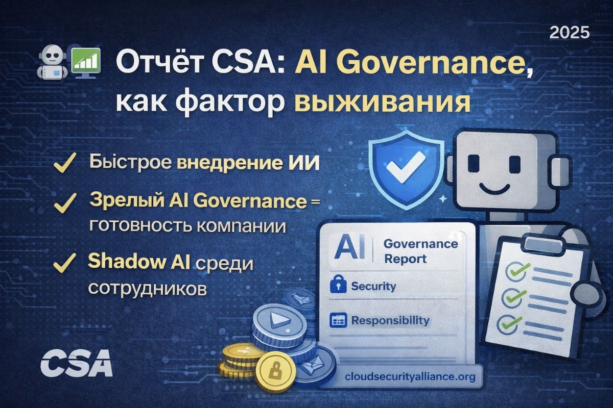 В 2025 году организации уже не просто пробуют ИИ, а внедряют его в продакшн. Проблема в том, что скорость внедрения ИИ сильно опережает зрелость AI Governance. CSA выпустили новый отчет, который основан на глобальном опросе IT- и ИБ-профессионалов (≈300 организаций), которых спрашивали не только о технологиях, но и о структурах AI Governance, ответственности за AI-риски и уровне подготовки команд. Главный вывод исследования: 👉 Зрелый AI Governance самый сильный предиктор готовности компании к безопасному внедрению ИИ. Не важно какой размер или бюджет у вашей компании. Важно иметь зрелый Governance. 📈 1. Множитель зрелости Что такое зрелый AI Governance на практике? Это рабочая система управления, которая включает: - чёткие роли и зоны ответственности, - политики использования ИИ, - контроль жизненного цикла моделей, - процедуры оценки рисков, обучение сотрудников. 🔥 Согласно отчёту, организации с формализованным AI Governance: в 2 раза чаще внедряют agentic AI, чаще проводят s