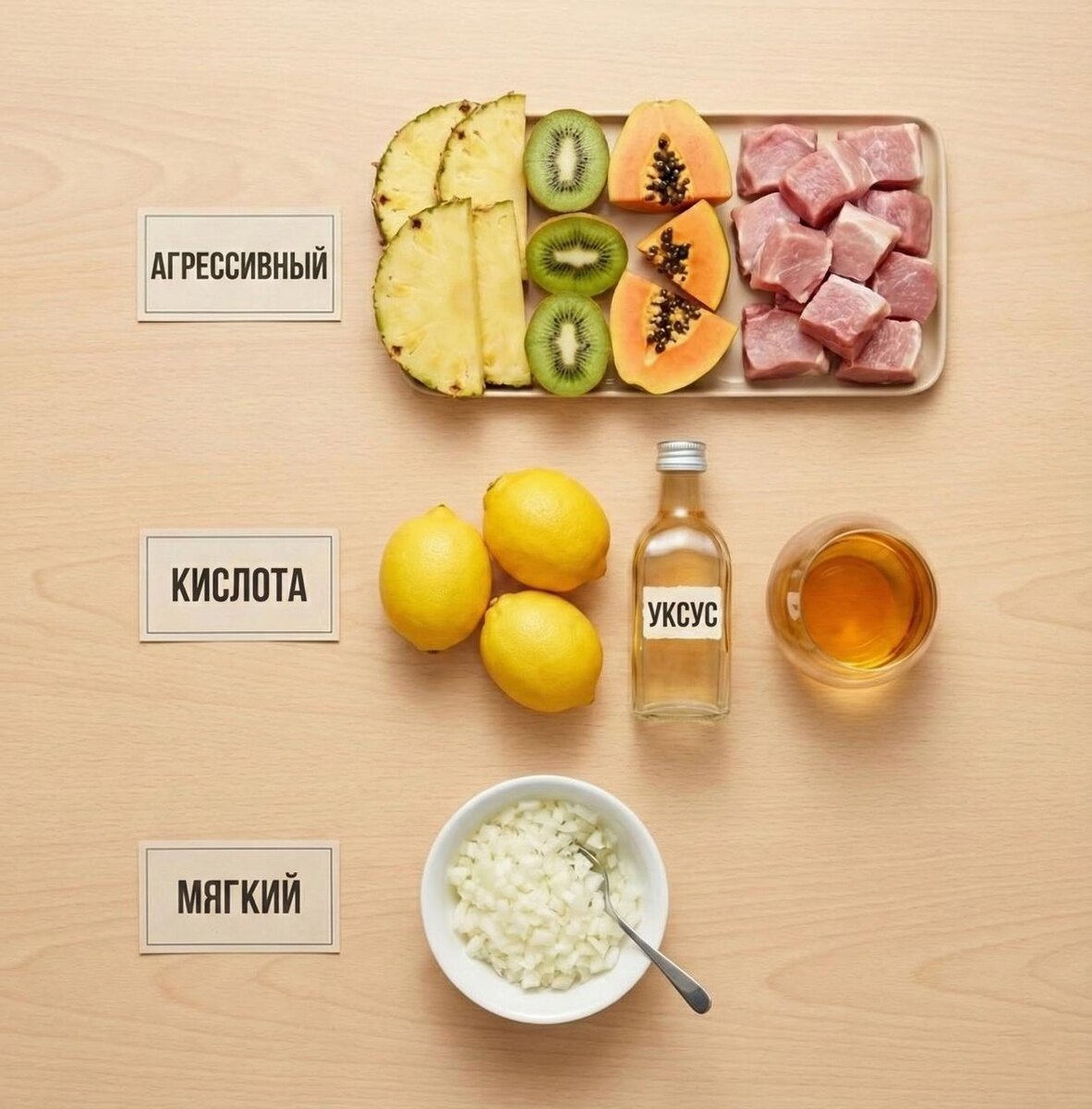 Как это использовать? 🍍 Только что выложил в Инсте ролик про то, как свежий ананас превратил мясо в слизь. Кто не видел - бегом смотреть, там наглядная боль. А здесь, как и обещал, разбираем биохимию процесса, чтобы вы не портили дорогие стейки. 🧪 В чем магия? В ананасе содержится фермент бромелайн. Это протеолитик, он расщепляет белковые связи. Грубо говоря, он работает как ваш желудочный сок, только снаружи. Поэтому у вас щипет губы, когда вы едите свежий фрукт, он буквально снимает с вас верхний слой клеток. В киви работает его брат актинидин. В папайе - папаин. Это «святая троица» убийц мяса. Но есть нюанс: Температура. Ферменты - это белки. При нагревании выше 65-70°C они денатурируют (разрушаются) и перестают работать. Поэтому консервированный ананас (который варили в сиропе) безопасен. Он даст только сахар и вкус. А свежий - активный хищник. 👇 Шпаргалка технолога: Сохраняйте, чтобы не получить «ватное» мясо на Новый год: 1️⃣ ГРУППА «СМЕРТНИКИ» (Ферменты) Кто: Свежий