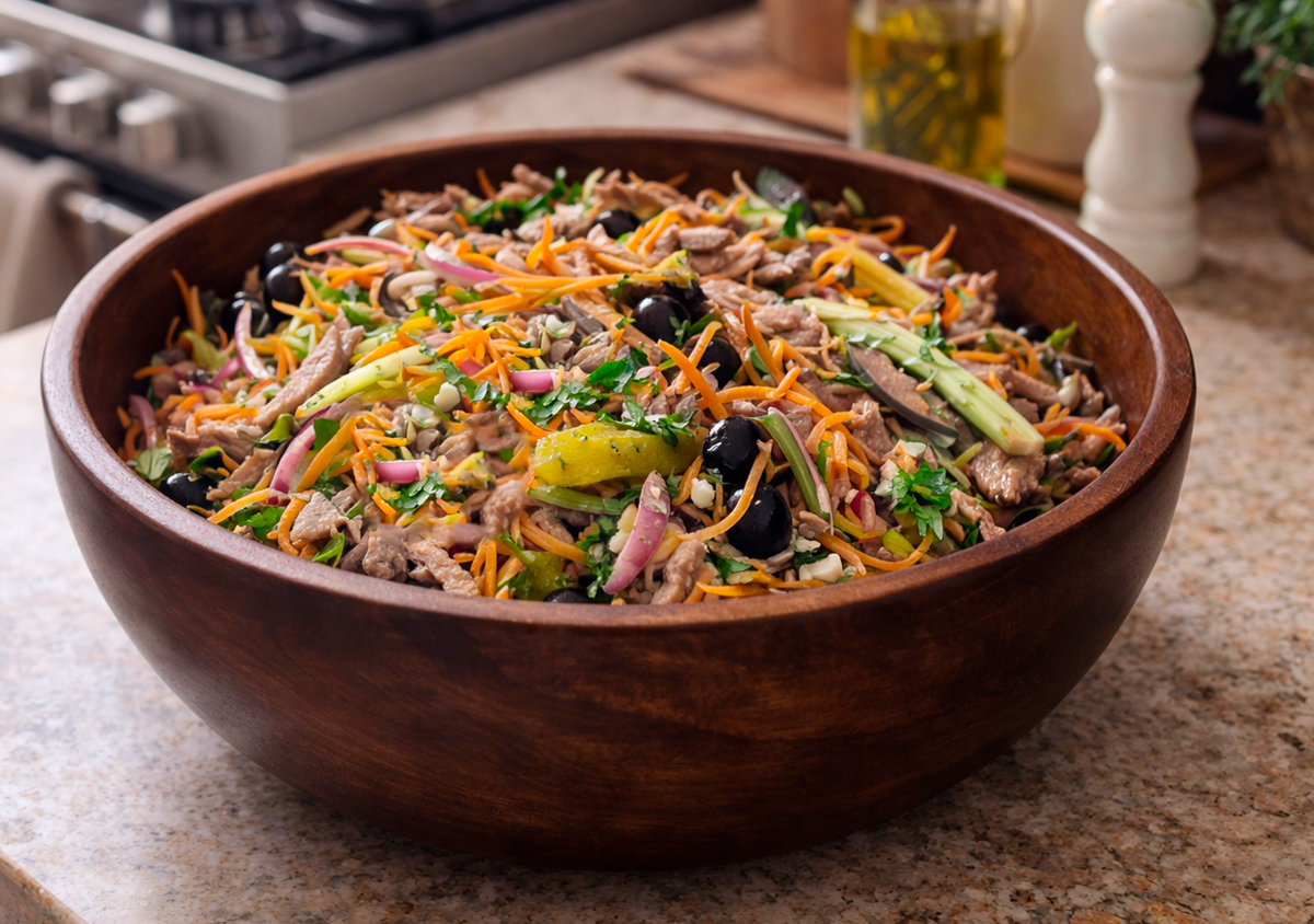Приветствую вас, друзья-гурманы! Праздничный экспресс все ближе приближается к станции Новый год. И уже многие начали составлять меню на праздники. Но не торопитесь ставить точку в выборе блюд. Подкидываем вам еще пару салатиков, которые хорошо будут съедаться в Новогоднюю ночь. Берем: Делаем: 1. Мясо варим до готовности (время зависит от куска, примерно 1,5-2 часа). Вынимаем из бульона и даем полностью остыть. Остывшее мясо нарезаем аккуратной соломкой. 2. Маринованные огурцы режем вдоль на пластинки, а затем шинкуем полосками, похожими на мясную соломку. Оливки режем просто пополам. Красный лук чистим и режем тончайшими полукольцами. Всю зелень (петрушку, укроп, зелёный лук) мелко рубим. 3. В миску отправляем: говяжью соломку, полоски огурцов, половинки оливок, морковь по-корейски, полукольца лука и гору зелени. Солим и перчим по вкусу. 4. Заливаем всё растительным маслом. Тщательно перемешиваем салат. Получается сочный, хрустящий, плотный и фактурный салат. Берем: Делаем: 1. Говядин