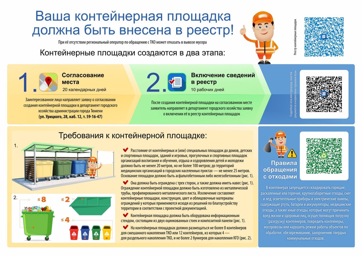 Создание новых и модернизация имеющихся площадок для сбора отходов – важный этап в формировании комфортной и безопасной городской среды. Любая площадка для сбора ТКО должна отвечать ряду критериев и быть внесена в реестр. В противном случае, региональный оператор по вывозу мусора вправе отказаться от ее обслуживания. Подробная инструкция по организации новой площадки ТКО и полный перечень требований представлены в прилагаемой инфографике.