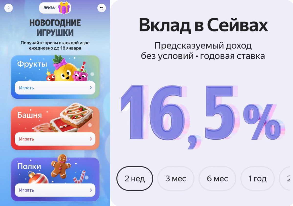 💸 Повышена ставка по вкладу на 14 дней до 16,5% годовых ⏺деньги застрахованы на 1,4 млн ₽ ⏺счет можно пополнить до 30🍋 ₽ ⏺счет открывается от 10 000₽ ⏺доступно пополнение в первые 7 дней с открытия ⏺можно открыть до 10 вкладов одновременно Новость 2 В Яндексе появилась возможность конвертации баллов Плюса➕ в рубли через компенсацию покупок. Баннер на главной странице. Новость 3 В Яндекс Дэйли открылись мини игры с призами до 18 января. Ссылка - ТУТ