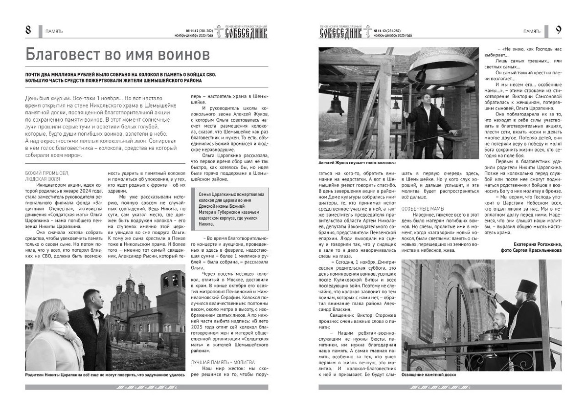 » В статье «Благовест во имя воинов» под рубрикой «Память» рассказывается о колоколе, который был установлен в честь погибших бойцов СВО в Никольском храме поселка Шемышейка и стал символом вечной памяти о земляках, отдавших жизнь за Родину.