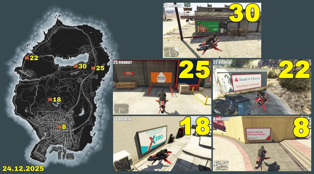 ) ❄ За порчу одного плаката платят 15.000$. Если закрасить все 5 плакатов в день, бонусом получите ещё 25.000$. Итого 100.000$ ежедневно. Закрасьте 5 плакатов и получите уникальный костюм "Уличный художник". Плакаты меняются раз в сутки в 9.00 МСК. Видео гайд: https://www.youtube.com/watch?v=sPQDYKq1d5M