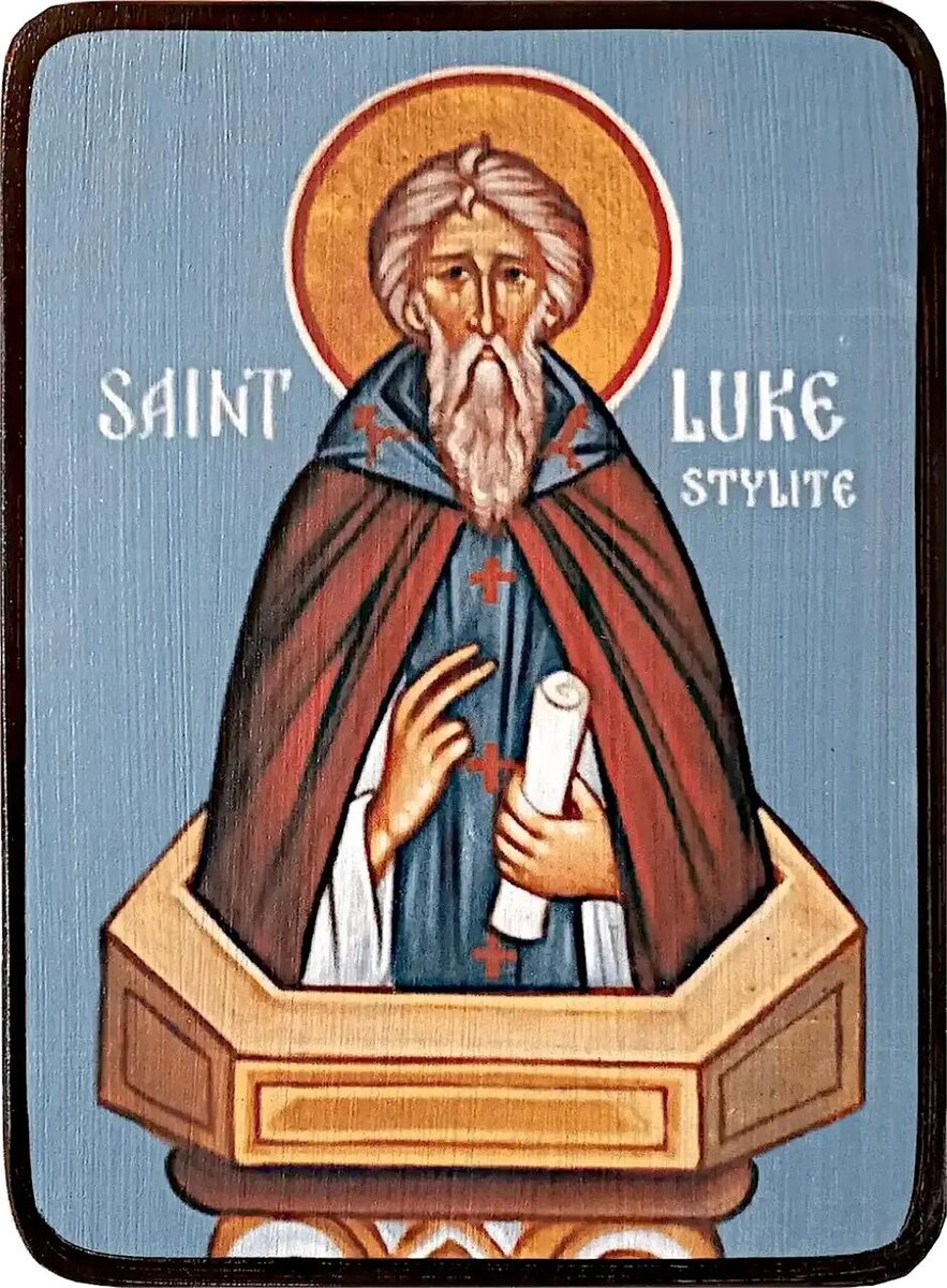 ) Преподо́бнаго отца́ на́шего, Луки́ но́ваго сто́лпника Стихи́: К высоте́ возведе́ Луку́ столп, Лука́ умо́м к Бо́гу, к Нему́же востече́. Сей бя́ше при Рома́не ста́рем царе́, и при Константи́не багряноро́днем зя́те его́, сы́не Льва прему́драго царя́. Патриа́ршествующу Феофила́кту, сыну того Рома́на царя́, от восто́к нарица́емь сын Христофо́ров, и Кали́син. Внегда́ у́бо болга́рская рать подви́жеся, тогда́ и сеѓо влеча́ше на воева́ние, повеле́ние одержа́щаго и́. Срази́вшижеся ра́ти, и неуставле́нию бы́вшу в во́ех, мно́гим ты́сящам па́дшым. То́йже Бо́жиим промышле́нием сохране́н быв. И мона́шеское житие́ восприи́м, и в поще́нии преспева́я. И поста́влен бысть презви́тер. И желе́зы себе обложи́в по всей пло́ти, и до шести́ дней постя́ся, и нико́е и́но в седмы́й день вкуша́я, то́чию приноша́емую ему́ просфо́ру, и зе́лие су́рово. И на столп вшед, и три ле́та на нем препроводи́в, и боже́ственный глас слы́шав. И призва́вшему его́ после́дствовав, по́йде ко Оли́мпу. И ка́мень во уста́ вложи́в м