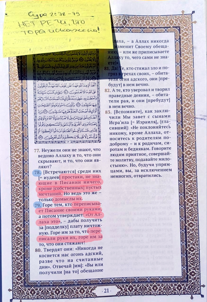Рубрика "Вопросы при прочтении и изучении Корана". Сура 2. Аят 78-79 ЧАСТЬ 21 78 аят, речь про людей, которые НЕ ЗНАЮТ ПИСАНИЯ Как можно исказить письменный текст Торы НЕ ЗНАЯ ЕГО? К тому же, как можно исказить текст, НЕ УМЕЯ ЧИТАТЬ И ПИСАТЬ? (арабское слово обозначает так Мухаммада, а мусульмане утверждают, что он не умел ни читать, ни писать) 79 аят, речь про ГРУППУ ИУДЕЕВ В этом аяте нет НИ ОДНОГО СЛОВА ПРО ТОРУ Если они пишут собственное Писание, то это отличительное ОТ ТОРЫ! Ведь Тора уже НАПИСАНА! А они пишут что-то СВОИМИ РУКАМИ, а затем выдают что это от Бога, когда как Тора уже всем известна как Писание от Бога! Тем самым, речь в данном аяте о тексте, которое отличается от Торы, но выдаётся за Божье Писание - это Талмуд. Заметим, Коран это Калям Аллаха и за каждое слово отвечает Аллах. Если бы речь шла про ПИСАНИЕ ИСТИННОЕ (Тора, Забур), то Аллах уточнил бы этот момент и сказал бы, что Тора искажена или Забур искажён Но речь в аяте об отличительном тексте, что ПЕРЕПИСЫВАЕТСЯ И