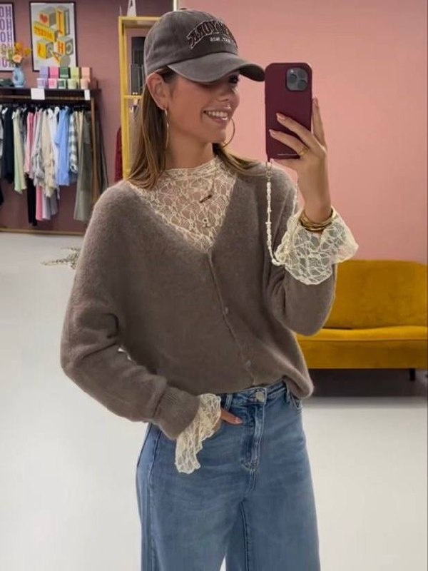 Это может быть джемпер или теплый кардиган. Главное, чтобы из-под вещи виднелся ажурный декор.