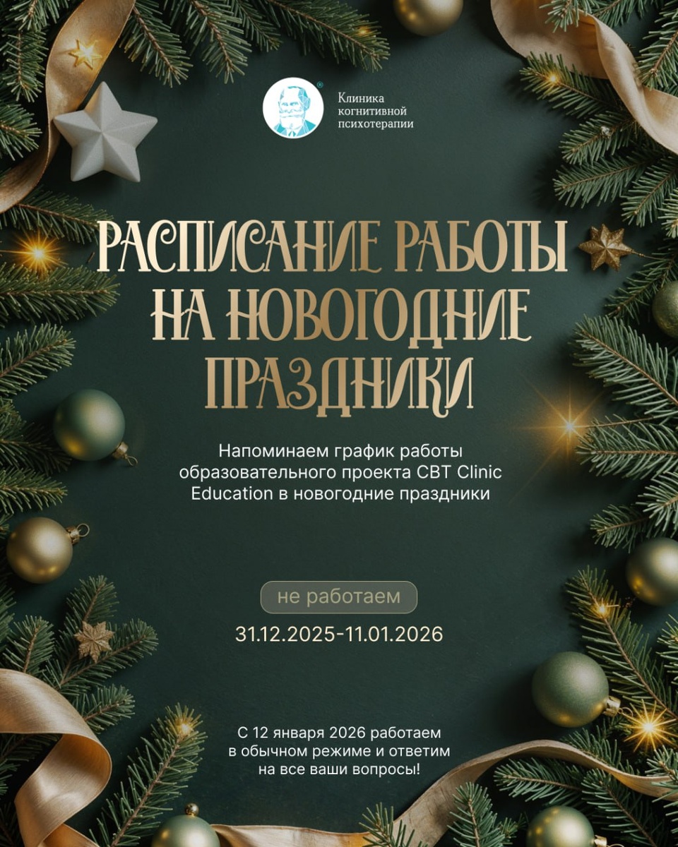 ! Спешим напомнить о графике работы CBT Clinic в новогодние праздники: Выходные дни: 31 декабря 2025 - 11 января 2026 С 12 января мы возвращаемся к обычному режиму работы и будем рады ответить на все ваши вопросы! Пусть ваши праздники будут тёплыми и радостными 💫 С любовью, Ваша команда CBT Clinic 💚