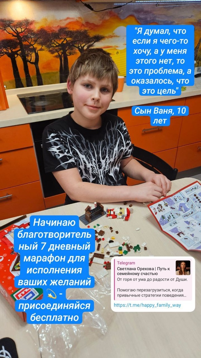 БЛАГОТВОРИТЕЛЬНЫЙ МАРАФОН ДЛЯ ИСПОЛНЕНИЯ ЖЕЛАНИЙ 1/7 Благодарность за всё материальное, что у нас есть. Оглянитесь вокруг и зафиксируйте, сколько всего у вас уже есть прямо сейчас, причём, множество из этого даже в избытке, ведь для выживания нам нужно намного меньше, чем нам кажется, остальное - это уже про уровень комфорта, который мы не замечаем, т.к. привыкли. Например, если вы дома то: 1. Одежды в шкафу в изобилии, нам всю не одеть сразу, 2. Еды в холодильнике и шкафах в изобилии, всё сразу и не съесть, 3. Воды в кране в изобилии, можно мыться, купаться, готовить очень много, 4. Дома тепло и светло, сухо и комфортно, даже когда на улице холодно, мокро и темно, 5. Туалет и ванна близко, там тоже тепло, светло и комфортно, канализация работает исправно, а ведь когда-то такое только у царей было, 6. Пространства для жизни и сна в изобилии, мебели и постельного белья в изобилии, шторы в наличие, безопасность, темнота и тишина для сна в наличие, 7. Гаджетов в изобилии, посм