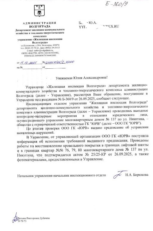 Жители домов № 125, 131, 133, 135 и 137 по улице Никитина в Кировском районе Волгограда вновь обратились в редакцию с коллективной жалобой. Поводом стали сразу две острые проблемы: последствия урагана, повредившего кровлю 16-этажного дома № 137, и длительное отключение горячей воды сразу в целом квартале. Напомним, в августе этого года после сильного урагана с дома № 137 по улице Никитина была частично сорвана крыша. Тогда жители заявляли об угрозе затопления квартир, выходе из строя лифтового оборудования и электросетей. Обращение получило широкий общественный резонанс и, по словам жильцов, было взято на контроль председателем Следственного комитета России Александром Бастрыкиным. К проверкам подключились СК, прокуратура Кировского района и жилищная инспекция. На днях собственникам поступил официальный ответ от администрации Волгограда и жилищной инспекции. В документе указано, что по результатам выездной проверки управляющей компании ООО «ГК „ЮРВ“» было выдано предписание, а нарушени
