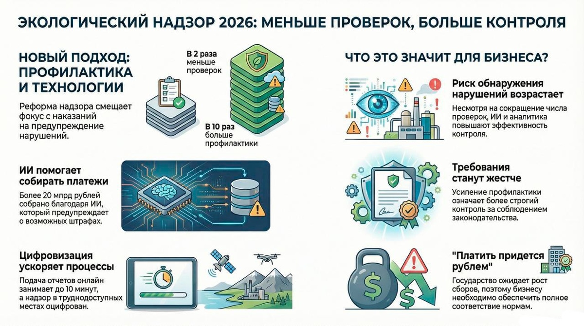 Итоги встречи Михаила Мишустина со Светланой Радионовой Премьер-министр провел встречу с главой Росприроднадзора. Вот несколько интересных тезисов, прозвучавших во время их беседы. Они позволяют предположить, что ждет природопользователей в 2026 году: 1️⃣ Меньше проверок, больше профилактики Реформа надзорной деятельности направлена на уменьшение числа проверок и повышение роли профилактики. По итогам года: ▪️Количество проверок снизилось в 2 раза ▪️Количество профилактических мероприятий увеличилось в 10 раз. 2️⃣ Контроль за платежами ▪️Общий объем собранных обязательных платежей составляет около 21 млрд рублей ежегодно ▪️более 20 млрд рублей собрали в рамках системы РОП с помощью применений алгоритмов ИИ. 3️⃣ Продолжение курса на автоматизацию процессов По итогам года: ▪️Оцифровка геологического надзора заменяет физическую инспекцию в труднодоступных местах. ▪️Пользователи могут подавать отчёты и обращения через личный кабинет, процедура подачи сокращается до 10 минут. ▪️Искусств