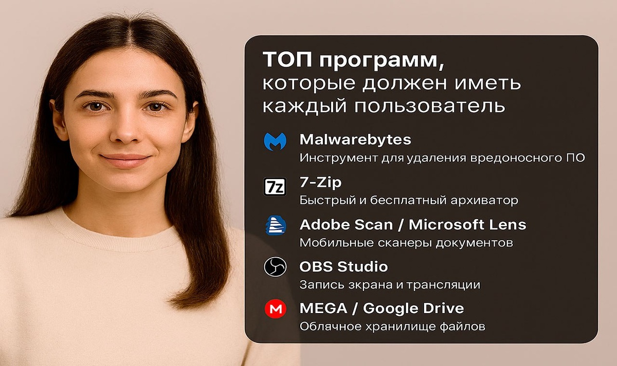 В мире софта легко потеряться, поэтому я собрал подборку топовых программ, которые действительно упрощают жизнь и работу. Это не реклама — только проверенные и полезные инструменты. 🛡 1. #Malwarebytes Один из лучших инструментов для поиска и удаления вредоносного ПО. Отлично дополняет стандартную защиту Windows. 📦 2. #7Zip Лёгкий, быстрый и бесплатный архиватор. Поддерживает все популярные форматы и работает быстрее многих аналогов. 📄 3. #Adobe Scan / Microsoft Lens Мощные мобильные сканеры, превращающие камеру телефона в полноценный инструмент для создания PDF и распознавания текста. 🖥 4. #OBS Studio Идеальная программа для записи экрана, стримов и создания обучающих видео. Бесплатная и очень гибкая. ☁️ 5. #MEGA / Google Drive Надёжные облачные хранилища для резервных копий, документов и важных файлов. Удобны для синхронизации между устройствами. 🧹 6. #BleachBit Чистит систему от мусора, временных файлов и кэша. Работает аккуратно и без лишних “оптимизаторов”.