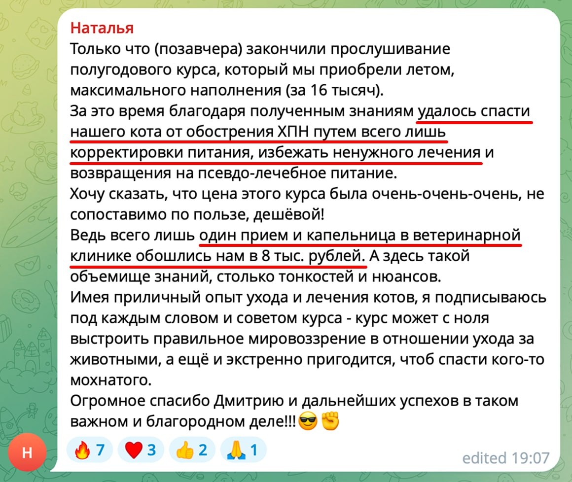 💔 Ещё + 1 история к сотням других… Кстати, в клиниках за лечение таких проблем люди отдают ~30-100 тысяч рублей, и не факт, что питомцу получится помочь. Участники моих же курсов решают и предотвращают эти проблемы в разы экономнее и с огромной вероятностью успеха. Поэтому, если у вас уже есть проблемы или вы их хотите предотвратить, то не ищите волшебную таблетку/корм, это не поможет. Просто восстановите и укрепите своему питомцу здоровье. И результат не заставит себя ждать. Переходите по ссылке и выбирайте материалы которые вам нужны : https://dmitryrusakov.ru/new_year_2026 ❗️Новогодняя распродажа закроется уже через пару дней.