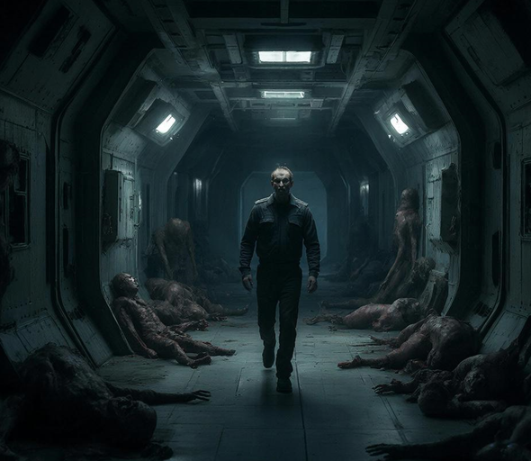 У дальней стены сидели двое. Первый — человек в потертом корпоративном скафандре с затемненным забралом. Второй — крупное гуманоидное существо в облегающем переливающемся комбинезоне, его конечности неестественно длинны даже для сидячей позы. Между ними — метра два. Ни следов паники, ни повреждений. Они не выглядели мертвыми — скорее, остановленными. Как экспонаты, из которых выключили питание.