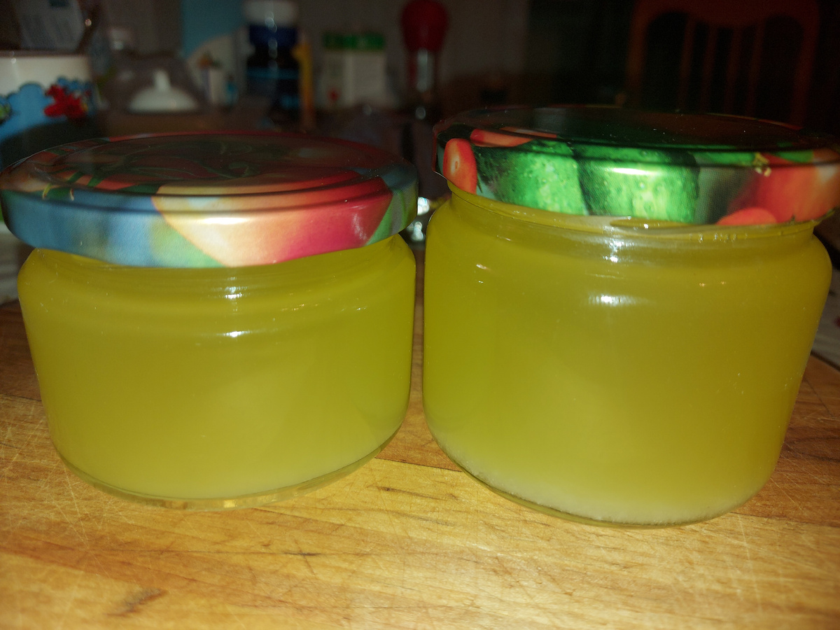 Далее горячий жир разливаем по стерилизованным баночкам и остужаем.