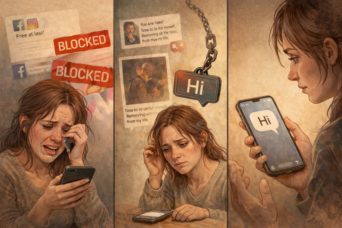 Это вообще высший пилотаж эмоциональных качелей. Сегодня он тебя блокирует везде. Демонстративно удаляет из друзей. Постит в сторис гордые цитаты про свободу. «Теперь я живу для себя». «Отпускаю всё токсичное из своей жизни». Ты ревёшь, как подраненный зверь. Носишь телефон по квартире. Проверяешь, не отвис ли блок. И как-то привыкаешь к этой боли. Начинаешь потихоньку собираться. Дышать. Не смотреть каждые пять минут. И ровно в тот момент, когда в тебе включается крошечный микроскопический интерес к своей жизни, вдруг на экране всплывает короткое: «привет». Ты ещё не успела восстановить пульс после прошлой волны, как новая накрывает с головой. Потому что за этим «привет» для тебя стоит целый роман. Тебе слышится: «я понял», «я соскучился», «я хочу поговорить», «я думал о нас». И ты мгновенно забываешь, что два дня назад ты была для него «токсичной», «мешающей жить», «виноватой во всех его несчастьях». Ты уже сидишь и думаешь, как ответить. Так, чтобы не спугнуть. Чтобы быть и не слишк