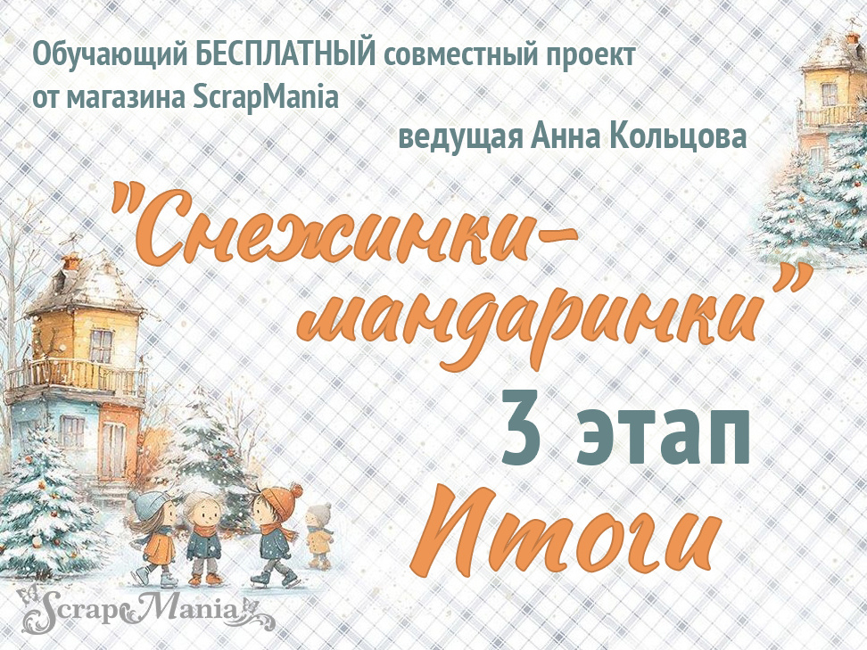 Доброго дня, дорогие наши читатели! Сегодня мы подводим итоги 3-го этапа нашего традиционного новогоднего проекта по новогоднему альбому. В этот раз наш проект называется "Снежинки-мандаринки"/#SM_спСнежинкиМандаринки с неподражаемой Анной Кольцовой! В этом году мы пошли на эксперимент: не только проект проводит приглашенный дизайнер, так еще и на этапах нет ОЭ (обязательных элементов), и сразу делаем два разворота за раз! Посмотрим, что в итоге получится, зайдет ли такое нововведение в нашем дружном государстве ScrapMania. На 3-м этапе нужно было сделать и показать обложку альбома с корешком, а так же фото переплета (если успели сделать). Победителем этапа Анастасия Таравкова! Примите наши поздравления, а по получению приза напишите мне в личные сообщения в ВК ➡ вот сюда. А теперь представляем вашему вниманию ТОП-7! Девочки, мы вас поздравляем! И сейчас разыграем среди вас призы: