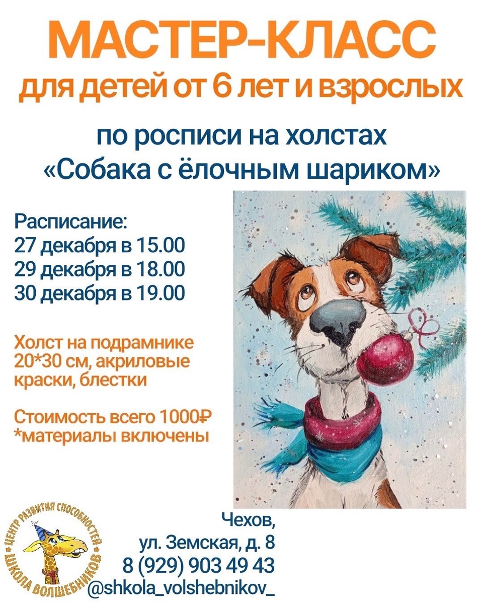 ✨ МАСТЕР-КЛАСС «Собака с елочным шариком»🐕 Напишем очаровательную картину с собачкой🐕на холсте акриловыми красками🎨 Такую работу можно повесить дома и подарить своим близким в качестве подарка🎁А также проведем отлично время в приятной компании🙂 Ждём Вас! 📅27 декабря 🕖19.00 29 декабря 🕕18.00 30 декабря 🕖19.00 💻https://vk.com/volshebnikiclub 🚫 Возраст: 6+ 🏢 Центр Развития "ШКОЛА ВОЛШЕБНИКОВ" 📍 г.Чехов, микрорайон Губернский, ул.Земская, д.8 🔗 Записаться: https://wa.me/+79299034943 ⭐Поддержать канал голосом #нгчехов #детямЧехов ✅ Мероприятия Чехов https://dzen.ru/id/66cc4b48e9ef144699238a51 http://vk.com/chekhov_events http://dzen.ru/chekhov_events