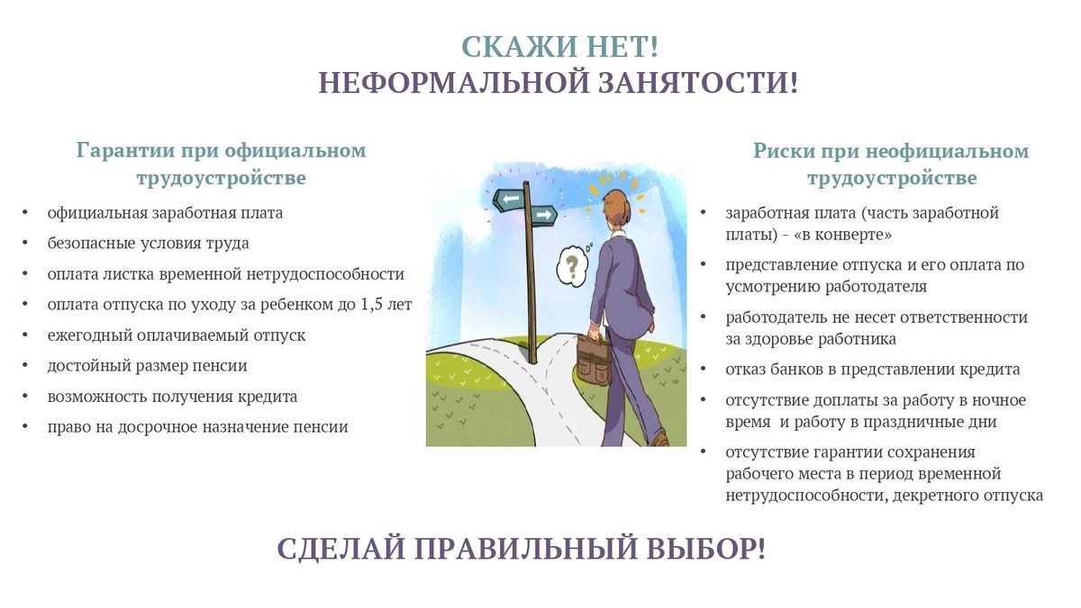 е. выполнение работ (оказание услуг) без оформления трудового или гражданско-правового договора, либо осуществление предпринимательской деятельности без официальной регистрации, предусмотренной законодательством. Трудовые отношения возникают между работником и работодателем на основании трудового договора (ст.16 Трудового кодекса РФ). Не оформление работодателем под любым удобным предлогом трудовых отношений повлечет за собой множество негативных последствий, в первую очередь лишение социальных гарантий, установленных государством и закрепленных трудовым законодательством и законодательством о социальном обеспечении.