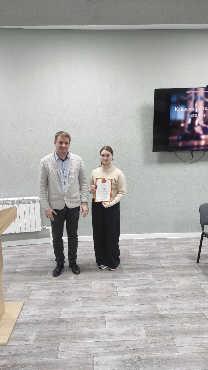». Организаторами мероприятия выступили доценты кафедры Виктория Крутикова, Оксана Нестерова и Павел Ерин. Доклады подготовили студенты 1 курса всех институтов университета. В рамках встречи обсуждались конституционные принципы, права и обязанности граждан, а также механизмы формирования государственной власти. В ходе круглого стола были распределены призовые места: · 1 место — Полина Кубай с докладом «Религия и атеизм в России»; · 2 место — Даниил Стародубцев с докладом «Права собственности в современном законодательстве» и Мария Нестерова с докладом «Роль президента в системе высшей власти»; · 3 место — Диана Чернышева с докладом «Какова процедура принятия законов в России». Завершение мероприятия стало площадкой для обмена мнениями и стимулированием интереса к конституционным темам среди молодёжи, а также подчеркнуло важность активного гражданского участия и дальнейшей научной работы студентов в данной области. 👻 MAX | 📲 ВК |