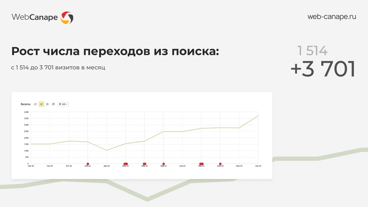 На конкурентном рынке, где каждый игрок стремится выделиться на фоне сотен аналогичных предложений, видимость сайта в поисковой выдаче — решающий фактор. Именно с таким запросом — продвижение по всей России — к нам пришел крупный импортер упаковки и тары. В копилке проекта — 24 года поставок из Китая, Индии, Вьетнама, стран ближнего зарубежья и большой интернет-магазин для оптовиков на 1С-Битрикс. Работы над новым проектом по продвижению мы всегда начинаем с SEO-аудита. Специалисты оценивают техническое состояние сайта, текущие позиции в выдаче, величину органического трафика. Сопоставляют все это с целями бизнеса, разрабатывают стратегию продвижения и прогнозируют результат. Для этого клиента мы расширяли семантическое ядро и структуру, подключали мультидоменность, устраняли технические ошибки и улучшали поведенческие факторы на сайте, много работали с контентом. В результате за год мы почти в 2,5 раза увеличили количество переходов из поиска — с 1 514 до 3 701 визитов ежемесячно. А