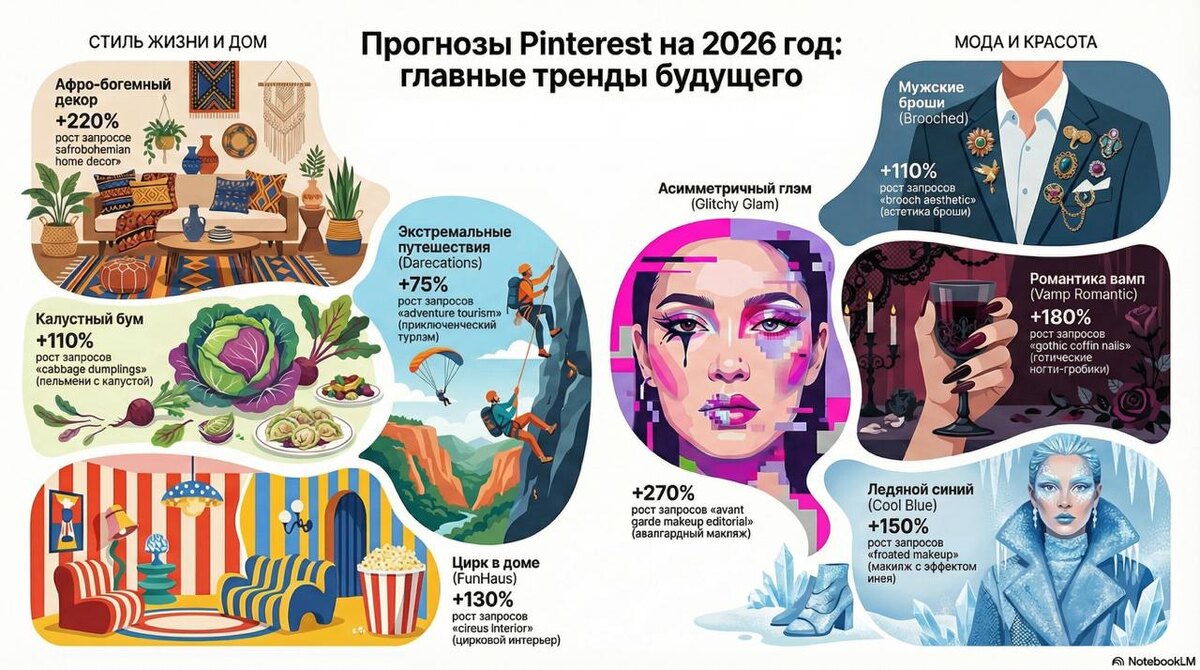 ? 🚀 Эксперты канала «Завтра Выиграй Сегодня» не ждут лучших времен. Мы берем идеи и превращаем их в результат прямо сейчас — с фокусом на главное. Это настоящий инструмент для лидеров [Миссия канала]. Мы проанализировали отчет Pinterest Predicts 2026, который предсказывает 21 не-еще-трендовое направление, чтобы вы знали, куда направить свое внимание и ресурсы, пока конкуренты спят. Пять самых мощных сигналов к действию, подкрепленных статистикой роста: • 👑 Эксклюзивность запаха. В 2026 году поколения Z и Миллениалы откажутся от простых ароматов в пользу индивидуальных, смешивая масла и парфюмы для создания своих уникальных формул. Поиск по «niche perfume collection» (коллекция нишевых парфюмов) вырос на +500% — это самый высокий показатель в отчете. • ⛰️ Мистика и путешествия. Люди будут искать волшебные и мистические места, такие как далекие руины, поглощенные туманом, или завораживающие леса. Поиск по «scotland highlands aesthetic» (эстетика Шотландского нагорья) увеличился на +