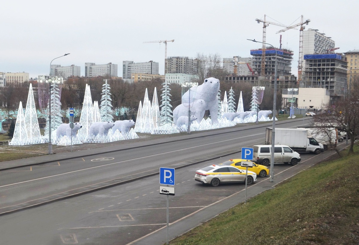 Сам я многократно проезжал за рулем по проспекту Мира, любовался мишками и все думал, что надо бы сделать остановку, пофотографировать их. А в итоге, когда наконец собрался с мыслями и отправился на фотоохоту, внезапно оказалось, что праздники уже закончились, а мишки покинули свои места ради летней спячки. Так что в этом году я решил не затягиваться и еще до наступления Нового 2026-го года поехал на проспект Мира в гости к белым медведям. Более того, посмотреть на них у меня получилось и при свете дня, и с вечерней иллюминацией. Конечно, во втором случае композиция выглядит куда более эффектно, но и днем медведи вполне хороши.