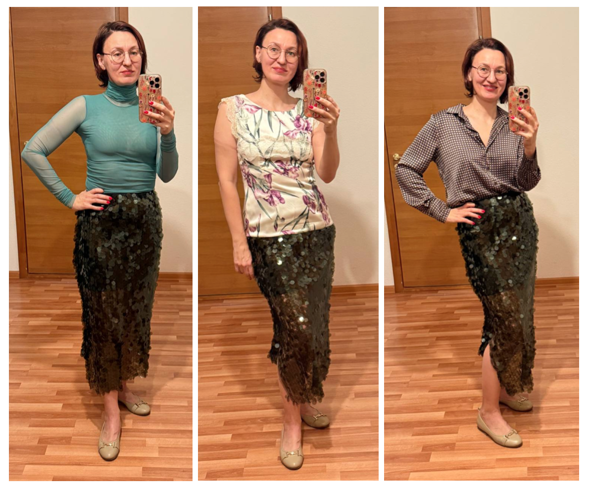 Помните, мы с вами в начале декабря разбирали образ образ с роскошной пайеточной юбкой, которую сразу после публикации «вынесли» из Zarina во всех размерах, кроме 2XS? Дышите) сейчас уже пополнили, можете идти покупать) тем более что я вам дала кучу идей как её носить в этом посте: Так вот! У нас есть фото образа Татьяны) и сейчас я вам покажу, как Татьяна с её куратором Натальей решили эту задачку (и нет, не так как я вам показывала, а иначе:) и это отдельный предмет моей гордости!) Но сначала посмотрите какие варианты были на входе у этой крутой творческой задачки: Все единогласно решили, что так не пойдет и стали выбирать искать варианты. И вот что получилось: Бельевой топ с кружевом, базовая хлопковая рубашка в качестве второго слоя с открытым плечом и узлом, тонкие прозрачные колготки, лодочки, крупные блестящие серьги и красная помада! В нашей ситуации часть вещей докупалась, потому что Татьяна находится в стадии формирования своего гардероба, у неё есть план пополнения гардероб