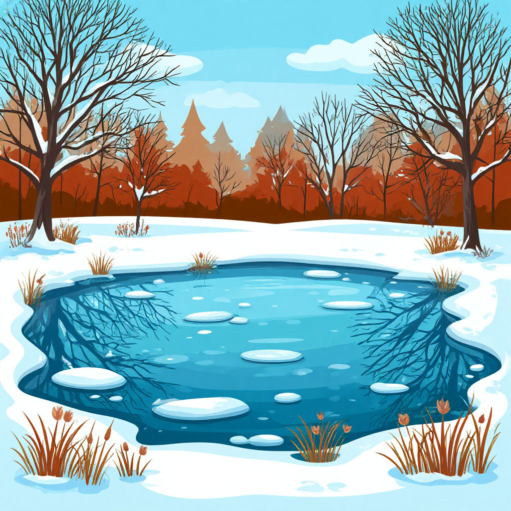 Ой, это же целое подводное царство! Ты когда-нибудь задумывался, как рыбки дышат, если сверху всё заперто ледяным замком? Пойдём скорее, я покажу тебе это чудо! Глава 3: Стеклянная крыша и подводный покой Артём и Рыжик вышли к лесному пруду. Летом здесь шумно квакали лягушки и летали стрекозы, но сейчас пруд превратился в огромное зеркало. Артём осторожно ступил на лёд и ахнул: сквозь прозрачную толщу было видно дно! — Рыжик, посмотри! — воскликнул он. — Рыбки! Они не застыли, они просто... очень медленные. Как будто они танцуют в замедленной съёмке! Мальчик прильнул к ледяной поверхности. Знаешь ли ты, что вода на дне пруда зимой всегда остаётся теплее, чем наверху? Она имеет температуру около +4 градусов — этого достаточно, чтобы рыбы не превратились в льдинки. Многие из них, например караси, зарываются в ил и впадают в оцепенение, а другие просто плавают очень медленно, чтобы не тратить силы. Но Артём заметил кое-что важное: пузырьки воздуха застряли под льдом, и их было совсем мал