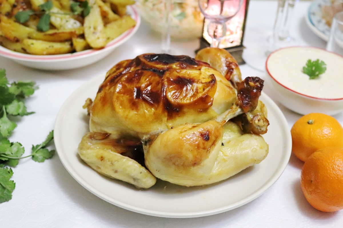 Курицу мы часто запекаем на праздники. Обмазываем и фаршируем разными ароматными вкусностями. Сегодня у меня новогодняя мандариновая курица. Маринад на соке от мандарина и фаршировала я её мандариновыми дольками. Есть еще одна хитрость: чтобы курица осталась сочной, мягкой и вкусной, я её замачивала в соляном растворе на несколько часов. Времени на приготовление ушло примерно 6 часов — 4 часа на замачивание в соленой воде + 1 час на маринование + 1-1,2 часа на запекание. Универсальная формула рассола: на 1 л воды надо 1/4 стакана соли + 1/2 стакана сахара.