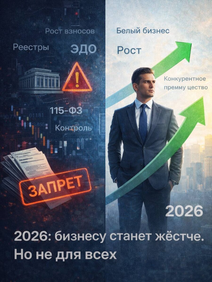 ‼️ Что же ждет бизнес в 2026 году⁉️ Если коротко: 2026 — это год, когда слабым станет дорого, а сильным — выгодно. Почти по всем фронтам: больше обязательных расходов, больше цифры, больше контроля. Но при этом появляются чёткие точки роста для тех, кто работает в белую и системно. Разберём по направлениям. 🔺 Главные тренды 2026 года 1️⃣Рост обязательной нагрузки Бизнесу придётся платить больше просто за сам факт существования: • рост МРОТ → рост фонда оплаты труда; • рост страховых взносов; • пересмотр и сужение льготных тарифов 15% для МСП; • «нулевые» компании перестают быть дешёвыми. 👉Содержать персонал, директора и «пустышки» станет ощутимо дороже. 2️⃣Налоги и страховые взносы ИП: • растут фиксированные взносы «за себя»; • сохраняется допвзнос 1% с дохода свыше 300 тыс. ₽; • увеличивается общий предельный размер взносов. ООО и АО: • вводится минимальная база по взносам за директора; • даже если: • нет деятельности, • нет зарплаты, • директор «на паузе» 👉взносы платятся