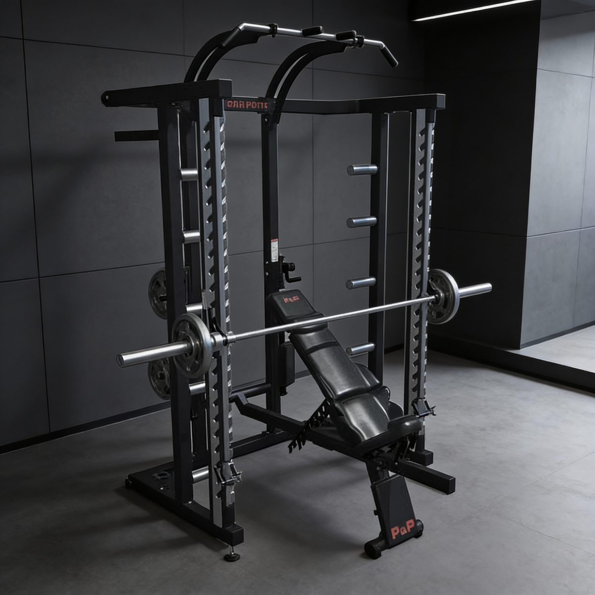 - Универсальность и компактность. В одной раме можно выполнять десятки упражнений: все виды жимов (лежа, наклонно, стоя, с груди), приседания, выпады, тяги для спины, подъемы на носки, даже некоторые упражнения на бицепс и трицепс. Это целый тренировочный комплекс «два в одном».