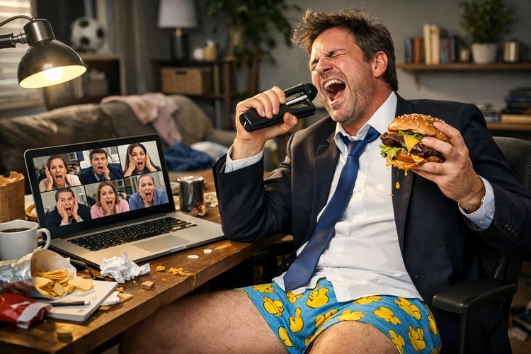 Это был отчетный Zoom с генеральным директором. Борис Петрович вещал про «синергию», «векторы развития» и «затягивание поясов». Скука смертная. Я был уверен, что я — ниндзя маскировки. Я нажал (как мне казалось) на перечеркнутую камеру и микрофон. Я был в безопасности. Я был в тени. Расслабившись, я откинулся в кресле. Сверху на мне была отглаженная белая рубашка и галстук — на случай, если вдруг заставят включиться. Снизу — семейные трусы с веселыми желтыми уточками. — Итак, коллеги, переходим к графику, — бубнил директор. Я решил, что самое время позавтракать. Я достал огромный, жирный бургер, который еле помещался в две руки. Соус капал на стол, я смачно откусил половину, вытирая рот рукавом той самой белой рубашки.