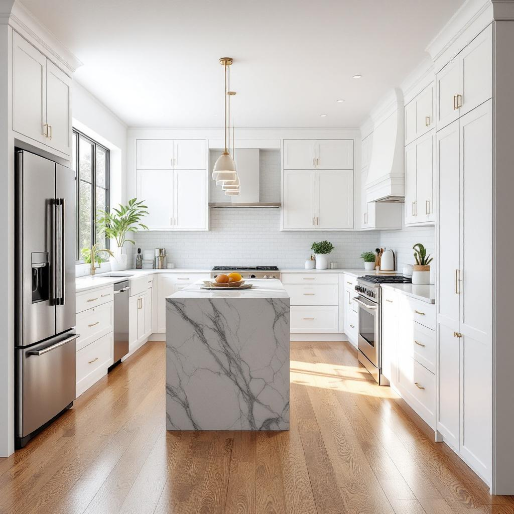 - Материалы «на показ». Сделайте акцент на столешнице из натурального камня (кварцевый агломерат) или на фартуке из стеклянных панелей с подсветкой.